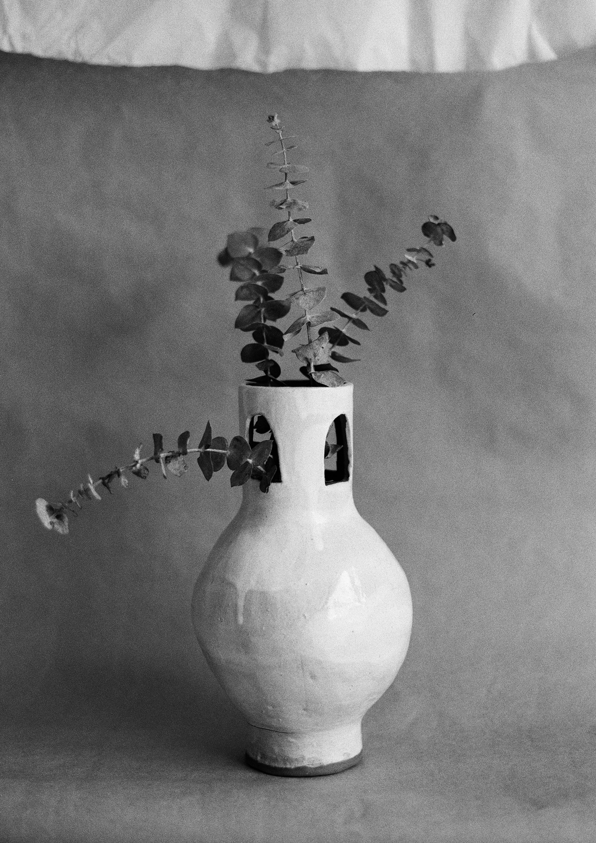 Hand-built vase with cut-out arch openings in the neck.