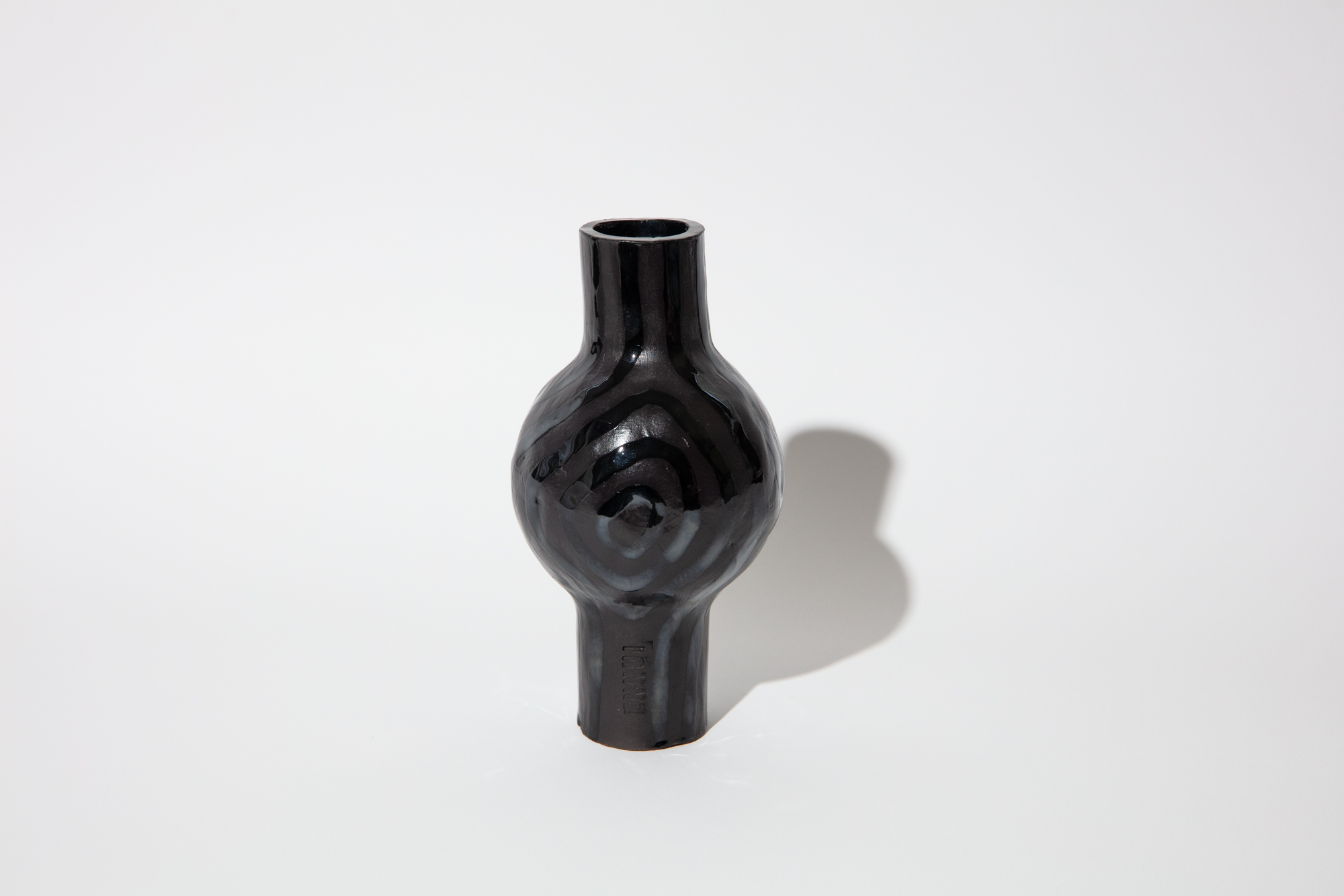 This vessel is made from black midfire clay, and features a subtle and playful pattern of gloss over the surface.