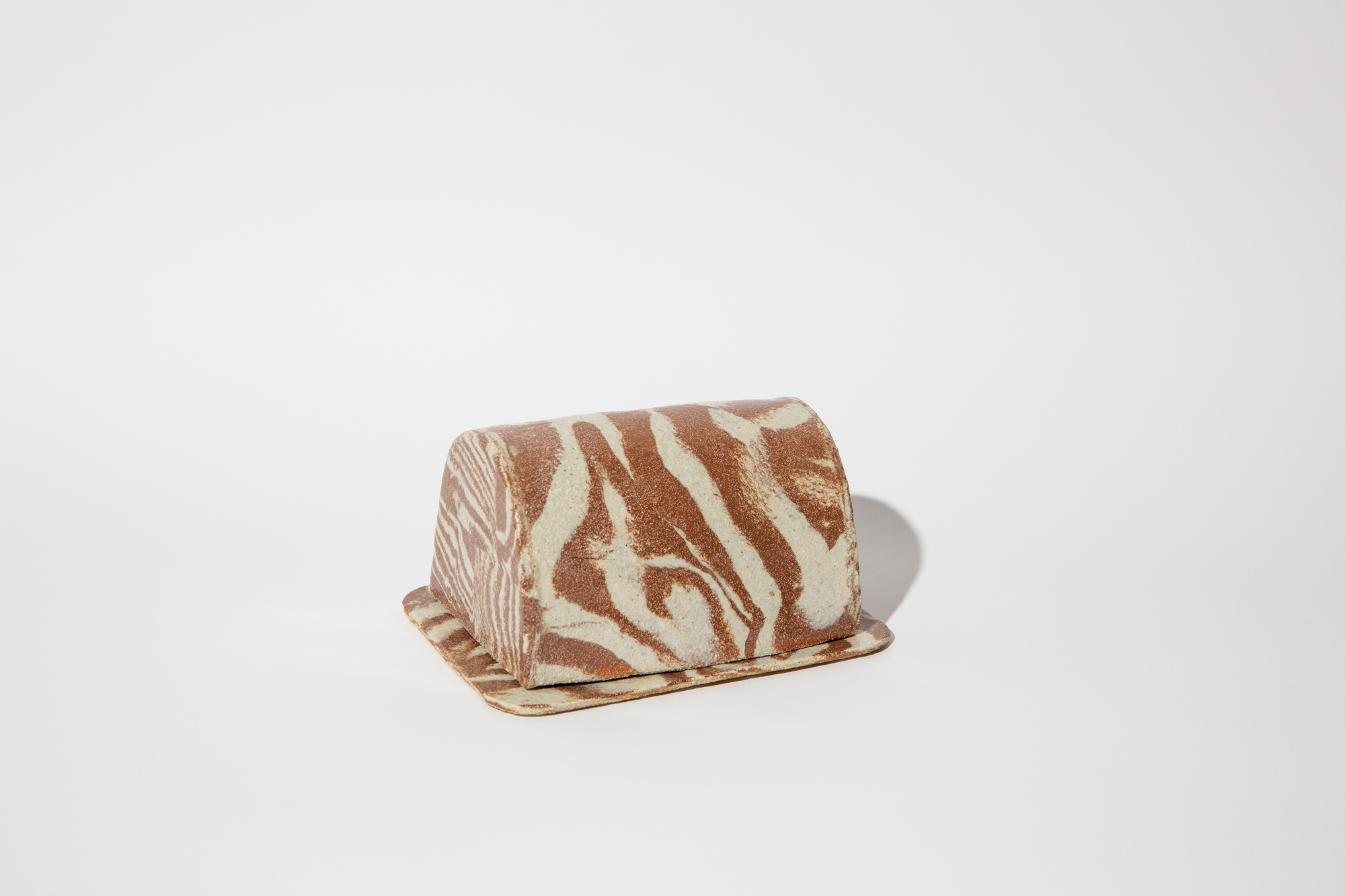 This dish is handmade from natural stoneware clay and has a separate tray and lid.