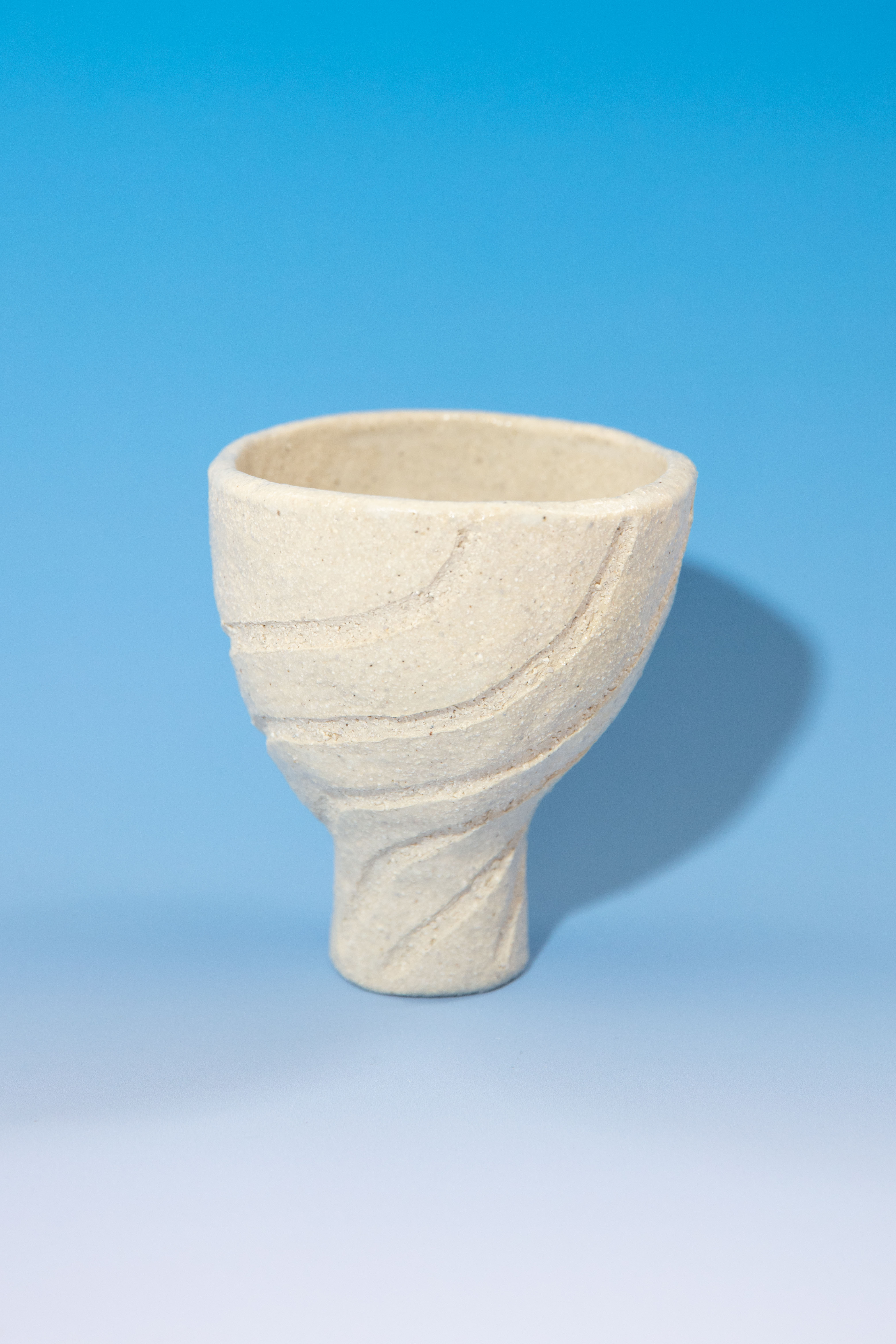 Lovely chalice made from natural stoneware. Ribbed pattern carved into the surface and coated in a pearly white glaze.