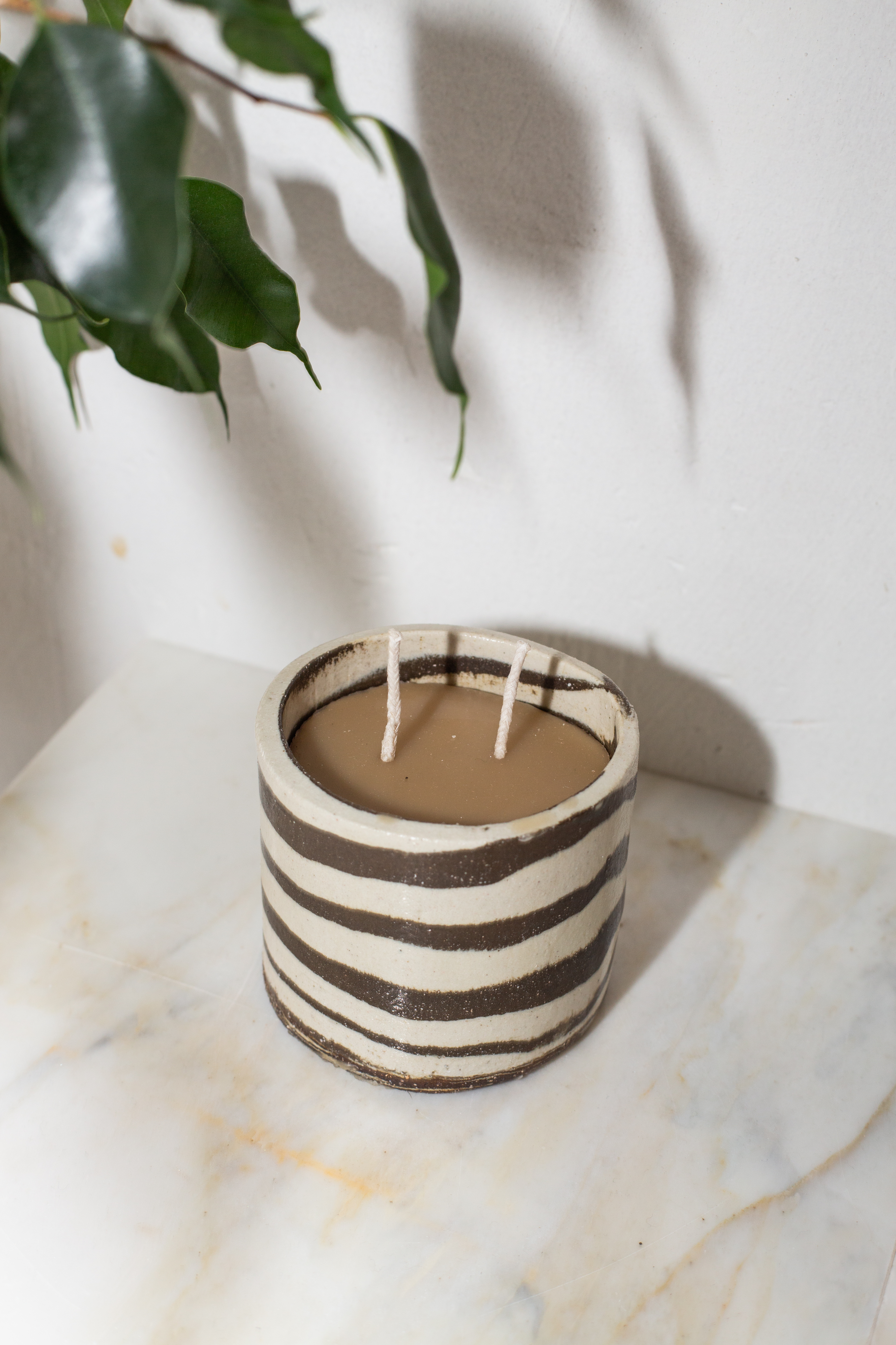 This jug is made from naturally textured stoneware, with painted copper stripes and matte white glaze.